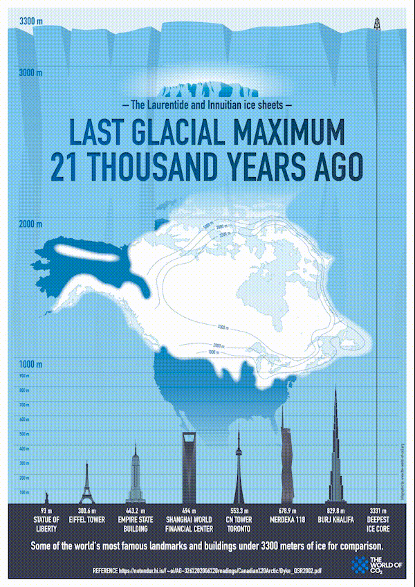 At the height of the last glacial period, Canada was covered with ice that could reach a maximum height of 3300 metres. This massive ice sheet covered Canada as well as areas in Europe and Russia all the way to Alaska. Everything above the Arctic Circle would have been uninhabitable, as Antarctica is today. Life would only have been possible at the edges of these huge ice sheets. Areas that are open to wild life above the Arctic Circle today would have been inaccessible to animals and plants. All in all, the huge land masses we live on today at much higher latitudes would not have been possible.